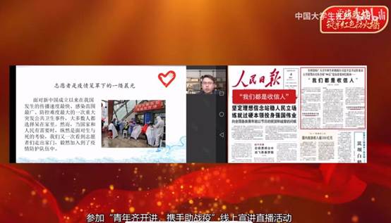 在这个直播中,我看见了来自几大高校的优秀的党员师生共同奋战,奔赴在学校、社区和处于疫情中心的同学身边。给医务人员送物资、给患病学生送安慰。这些高校党员都以不同的方法去投入到这场战争中去贡献自己的力量,成为“逆行者”的一份子。