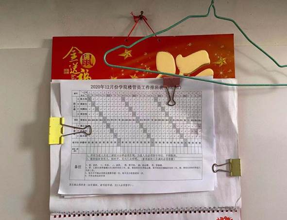 候奶奶负责励志楼A栋教学楼的管理,墙上的日历本上夹着楼管的值班表,并且在日历上标注了自己的值班上班时间。就连电脑后也都贴上了楼管的工作安排、励志楼上下课的具体时间调整。