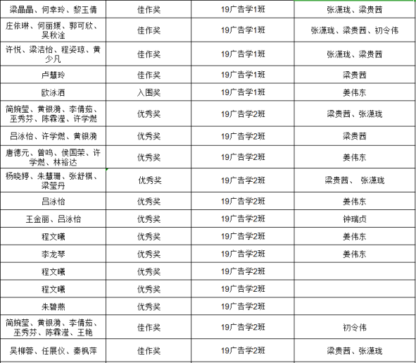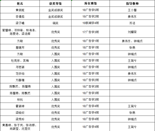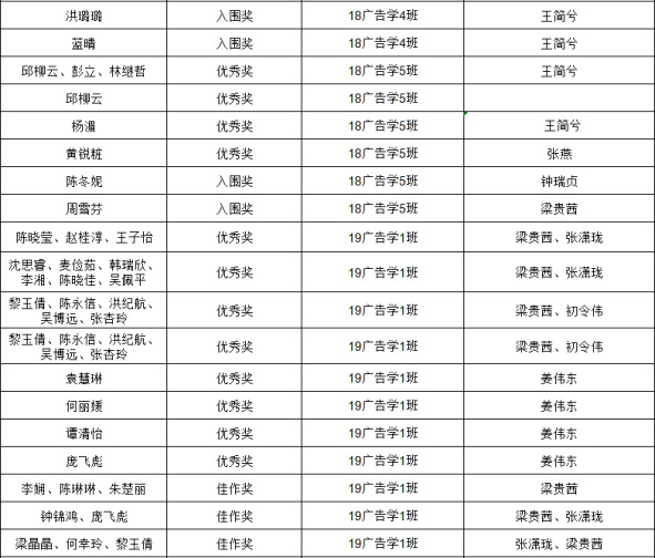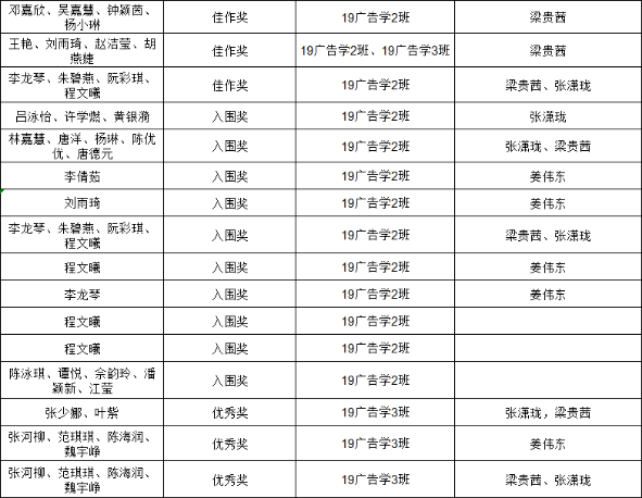 近日,由中国广告协会主办的2020中国大学生广告艺术节学院奖秋季赛落下帷幕,太阳成tyc9728集团师生在该项赛事中再创佳绩,总计获得108项奖项。其中,黄锐粧、李倩茹同学的作品荣获金奖或银奖(两项作品最终获奖等级将在颁奖盛典上隆重揭晓),梁子晴同学的作品荣获铜奖,以上获奖作品分别由王小慧、姜伟东、苏洁三位老师指导。另外,管慧琳等同学多名同学的作品荣获优秀奖、入围奖、佳作奖,刘耀荣、姜伟东、钟瑞贞、张燕、王简兮、梁贵茜、张潇珑、初令伟、赵安琪、苏洁等老师指导了上述获奖作品。
