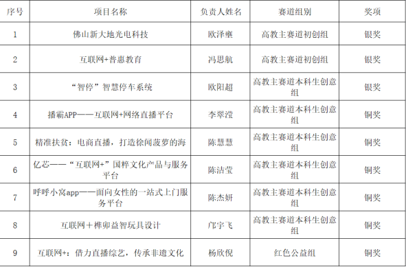 经过初赛、复赛的层层选拔,我院共有9组项目进入最后奖项的争夺,参赛选手们分别从项目背景、项目简介、项目商业模式、项目发展规划、项目财务分析等几个方面,以PPT展示的方式进行现场演说,专家评委根据选手所演说内容进行现场提问,参赛项目组对专家评委提出的问题作出解答。最终,我院共有3组项目获得高教主赛道银奖,分别为冯思航同学的《互联网+普惠教育》、欧阳超同学的《“智停”智慧停车系统》和欧泽壅同学的《佛山新大地光电科技》,5组项目高教主赛道铜奖,分别为陈慧慧同学的《精准扶贫:电商直播,打造徐闻菠萝的海》、陈杰妍同学的《呼呼小窝app——面向女性的一站式上门服务平台》、陈洁莹同学的《亿芯——“互联网+”国粹文化产品与服务平台》、李翠滢的《播霸APP——互联网+网络直播平台》,杨欣倪同学的《互联网+:借力直播综艺,传承非遗文化》获得青年红色筑梦之旅赛道铜奖。
