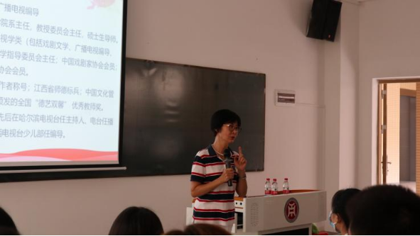 从头发长见识短这一俗语入手,新闻系执行主任占自华老师以自身为例,风趣幽默的表达了头发长与见识的长短是并不相关的。她还通过与学生的互动交流进一步指出,一个人在未来会成为怎么样的人也还是不确定的。在她看来每个人“是谁”其实都掌握在自己的手中,相信自己,敢于去尝试,去寻找“我是谁”,那么无论是试错或是找到正确的道路,其中都蕴含着不确定性所绽放的美丽。此外她还通过三个砌墙工人的故事,浅显易懂的体现了目光远大的意义,劝诫同学们要敢想敢做,发挥自己未知的潜力。并在最后占自华主任对新生寄语,大学生是有希望,有态度,有情趣的,为新生们献上了美好的祝愿与诚挚的祝福。