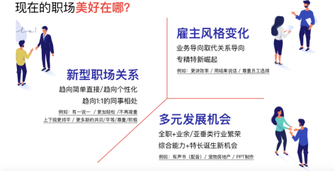 讲座一开始,蚁畅老师就从一系列数据出发,为大家揭示了当下就业市场的现状。为大家分析了当下职业发展策略的变化。他提出虽然就业市场竞争越来越激烈,但当下职场也发展出一系列向好的趋势:如更简单直接个性化的新型职场关系、业务导向取代关系导向的新型雇主风格,还有更多元的发展机会。