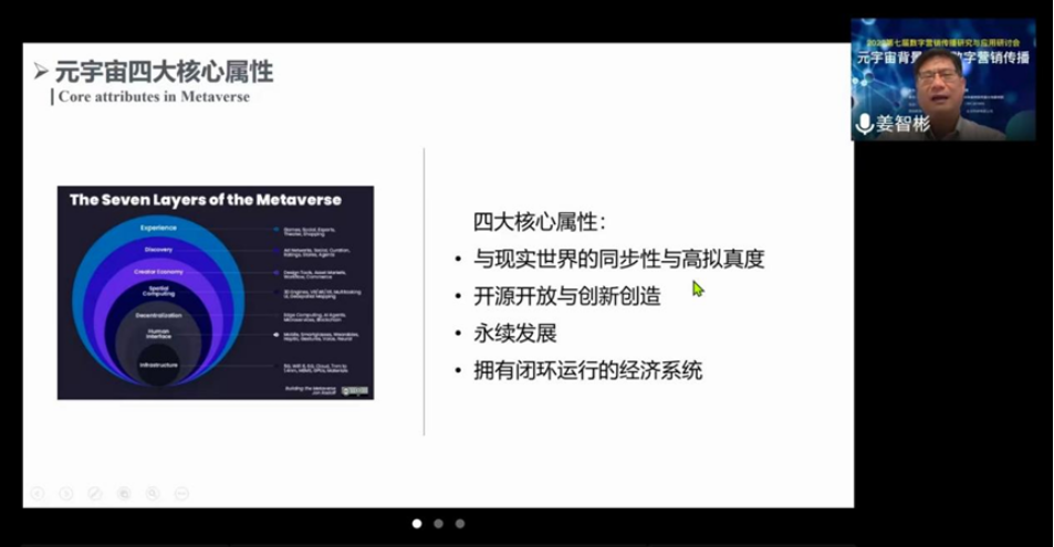 上海外国语大学传播学教授、博士生导师、智能广告与传播科学研究所姜智彬所长以“元宇宙广告:从二维到三维的互联网场景新营销”为题展开演讲,探讨包括元宇宙传播逻辑:延展融合触达的数字技术;元宇宙营销:虚拟人社交与游戏多赛道齐发;元宇宙广告主:从实体到虚拟的营销新战场;元宇宙消费者:从旁观到参与的价值新创造;元宇宙广告公司:从单向到适配的业务新机遇5个方面。并介绍了元宇宙的四大核心属性。