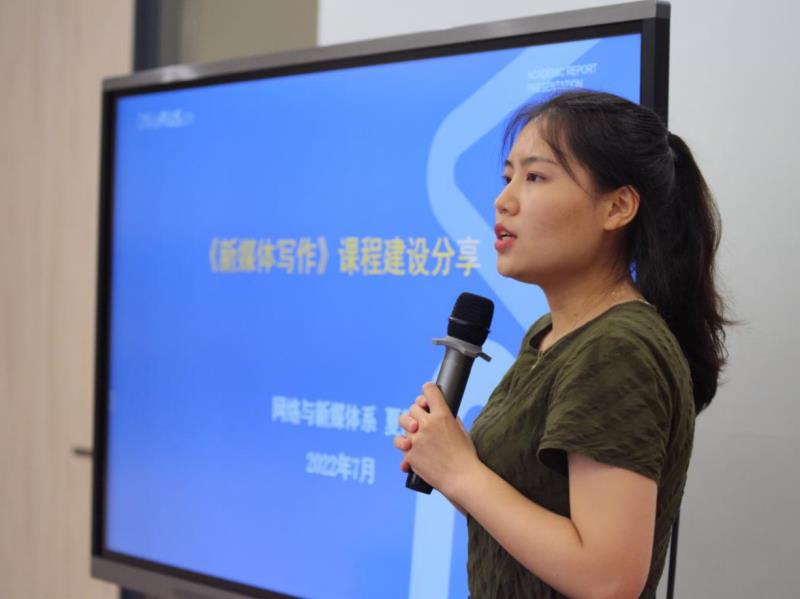 夏厦老师从《新媒体写作》四轮的教学实践,从课程总体设计、教学改革探索、课程建设方向、存在的问题四个方面进行了分享。尤其是自己在教学改革探索过程中总结的四点经验:线上线下混合教学模式;和传院自媒体矩阵建立关联;与头条学院、头文科技等公司进行课程共建;过程和成果相结合的评价模式。