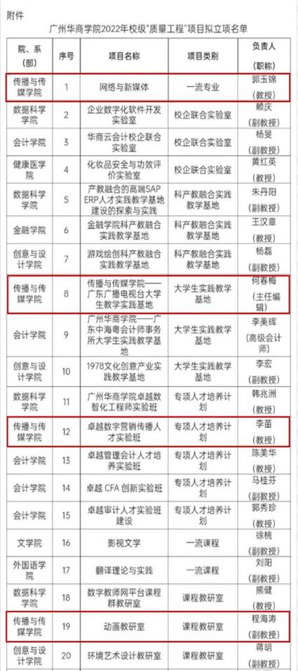 其中,郭玉锦教授主持的“网络与新媒体”获得校级一流专业项目立项;何春梅教授主持的“太阳成tyc9728集团——广东广播电视台大学生教学实践基地”获立校级大学生实践教学基地项目;李苗教授主持的“卓越数字营销传播人才实验班”获立校级专项人才培养计划;程海涛副教授主持的“动漫教研室”获立课程教研室项目;龚丽主持的“OBE理念下《新闻传播学研究方法》课程教学模式改革与研究项目、刘树林主持的“‘知、行、创、思’四位一体的同步混合教学模式设计与实践、温丽琼的新媒体时代《网络直播》课程的教学实践与改革探索分别获得高等教育教学改革项目课题获得立项。另外,张志荣老师主持的“共生理论视域下应用型大学创新创业教育与专业教育的融合路径研究——以tyc太阳成9728集团为例”获立创新创业教育专项研究课题项目。