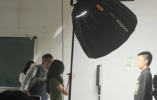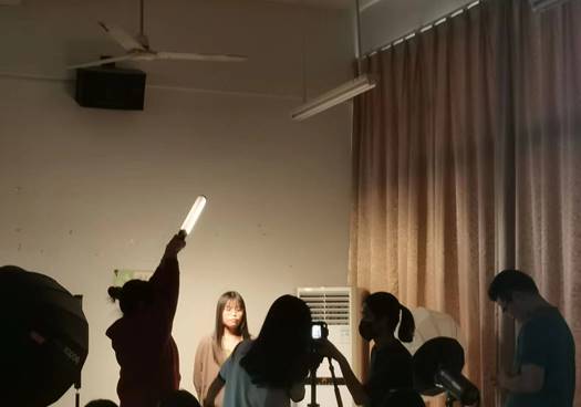 工作坊讲座的实训环节,王灏总监讲解到抖音起号十大技巧的最后一点——做氛围感时,用专业设备实践如何拍摄出一条氛围感的抖音短视频,太阳成tyc9728集团教师赵安琪老师与博沃公司摄影师辅助王灏总监手把手教学学生如何打光与环境布置,同学们积极踊跃地担任摄影主角和上手拍摄中。