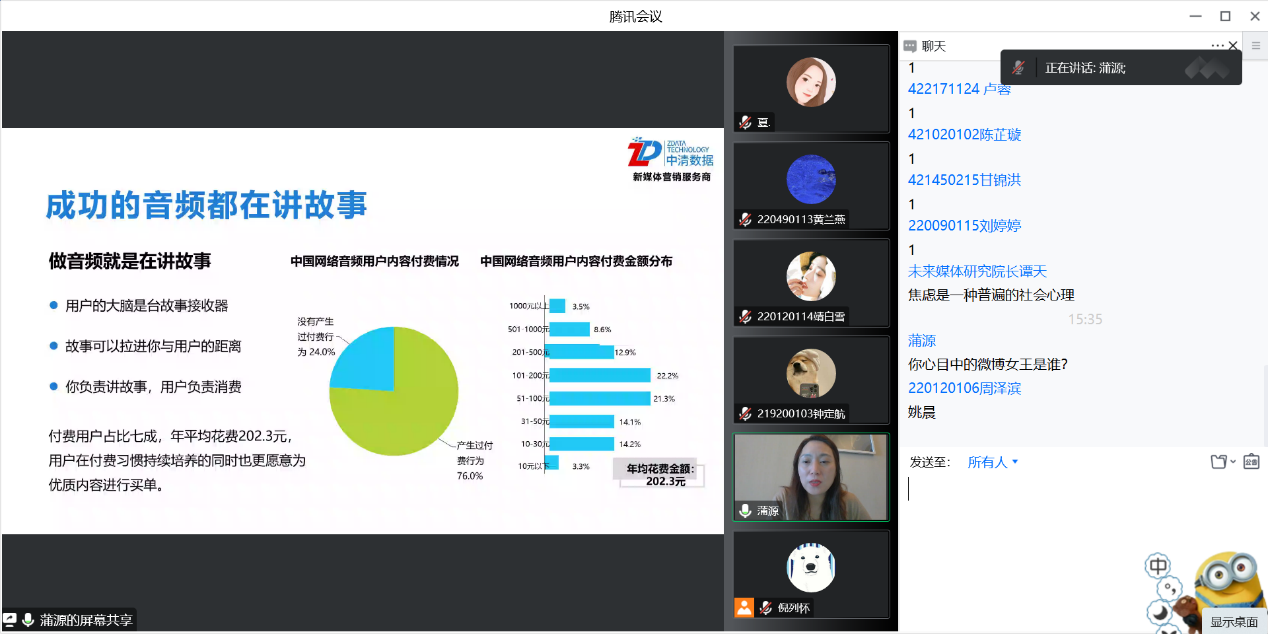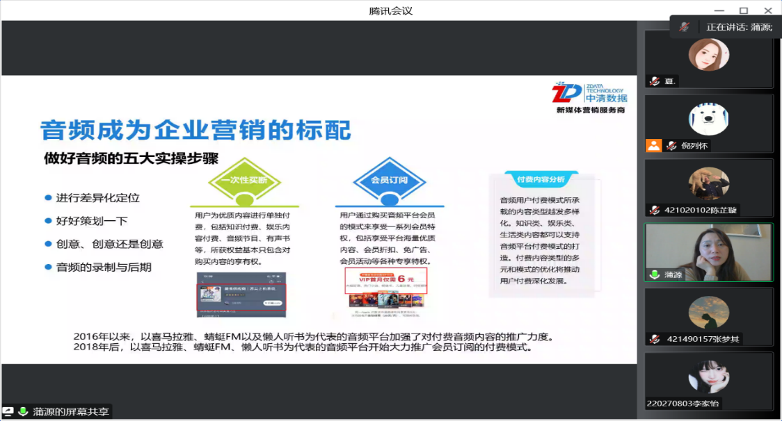 2022年11月7日14:30,太阳成tyc9728集团网络与新媒体系邀请中清数据(广州)科技有限公司蒲源总经理,为大家开展主题为《音频会成为下一个社交宠儿吗? —— 5G时代音频布局与营销革命》的讲座。华商学院特聘教授、未来媒体研究院院长谭天教授,太阳成tyc9728集团倪列怀副院长出席了本次讲座。因为疫情防控原因,本次讲座为线上形式,讲座总参与人数达到腾讯会议上限300人。