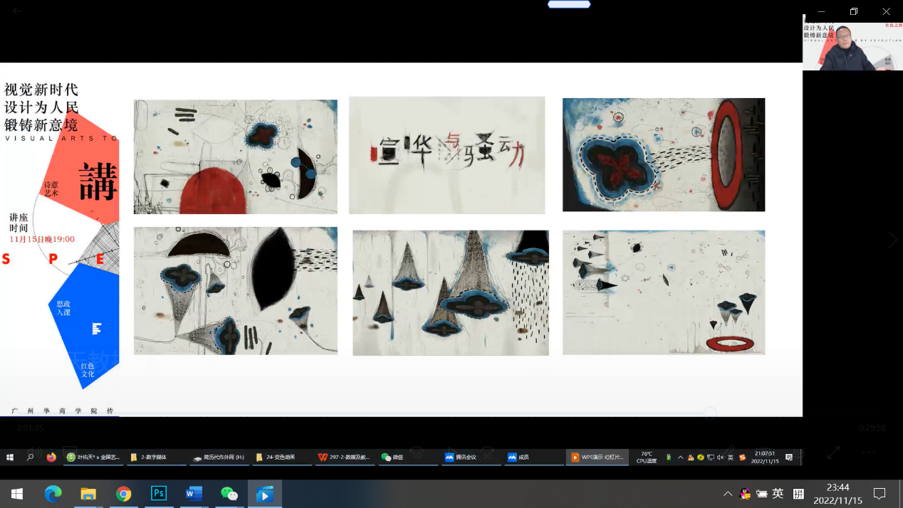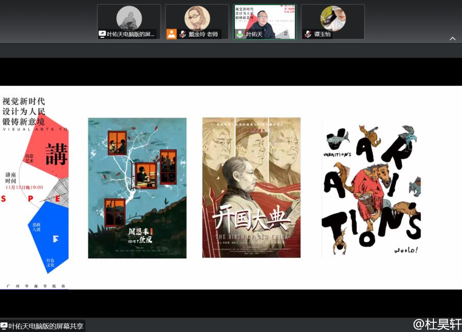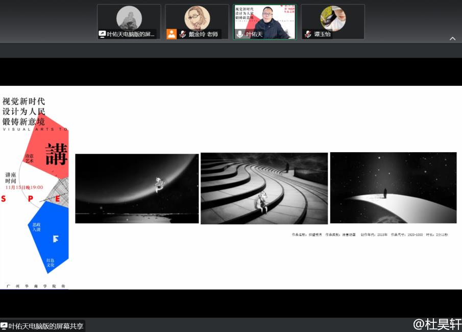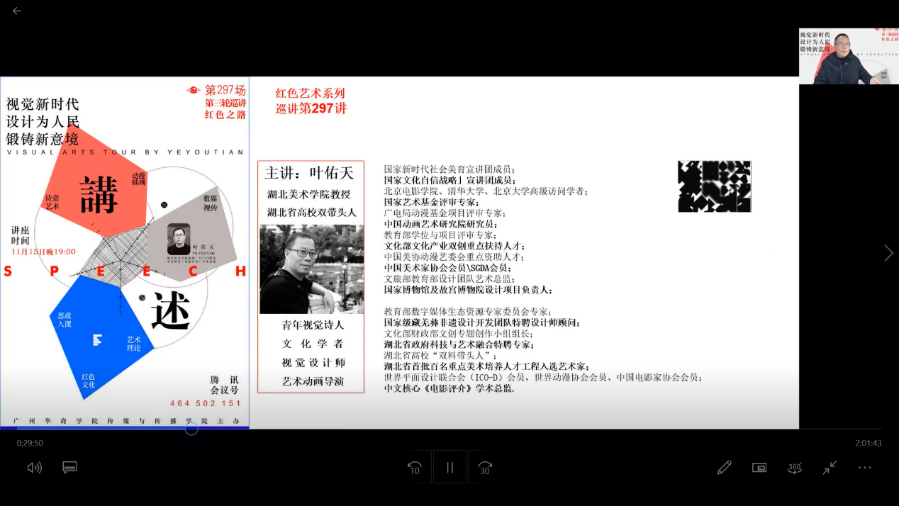 2022年11月15日19:00,太阳成tyc9728集团网络与视频系邀请湖北美术学院叶佑天教授,开展主题为《“视觉新时代:设计为人民+锻铸新意境”》的学术讲座。视频系副主任戴金玲副教授是本次会议的主持人。因为疫情防控原因,本次讲座为线上形式,讲座总参与人数达到腾讯会议上限300人。