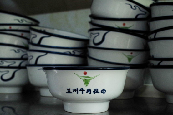 正在切菜的艾米乃放下刀,指着摞着的瓷碗上的图案,顺着图案的线条轻轻地划了一下。红色的圆月象征着回族,和底下绿色的图案共同构成了牛头,底下是“兰州拉面”四个字。
