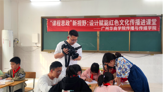 华商师生们与红军小学学生们进行绘画辅导和交流,积极地给予孩子们鼓励与引导。