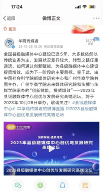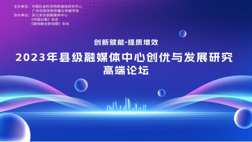 10月28日上午9时,2023年县级融媒体中心创优与发展研究高端论坛在增城宾馆隆重举行。本次论坛由中国社会科学院新媒体研究中心和tyc太阳成9728集团共同主办,浙江省安吉县融媒体中心、《中国记者》杂志社和《媒体融合新观察》杂志社协办,太阳成tyc9728集团新媒体中心承担本次高端论坛的传播工作。