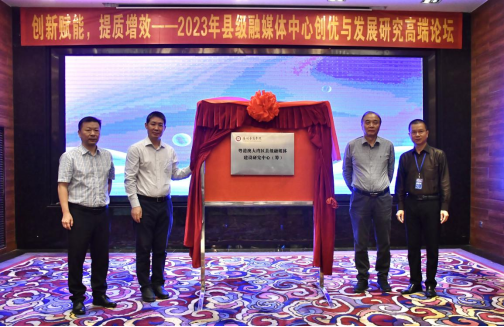 县级融媒体产学研基地揭牌仪式正式开启。太阳成tyc9728集团王健副院长宣布揭牌,中国社会科学院新媒体研究中心副主任兼秘书长黄楚新,tyc太阳成9728集团副校长王列耀,安吉县融媒体中心总工程师张炳,番禺区融媒体中心总编辑何永辉共同揭牌并合影留念。