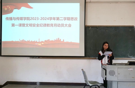 本次文明安全纪律教育月动员会暨思政第一课为我院“文明安全纪律教育月”活动的开展奠定了基础,我院各班将以此为契机加强学生的言行举止、遵规守纪教育,强化学生的安全意识,树立榜样典型,构建良好的班风、学风,为和谐校园建设贡献力量。