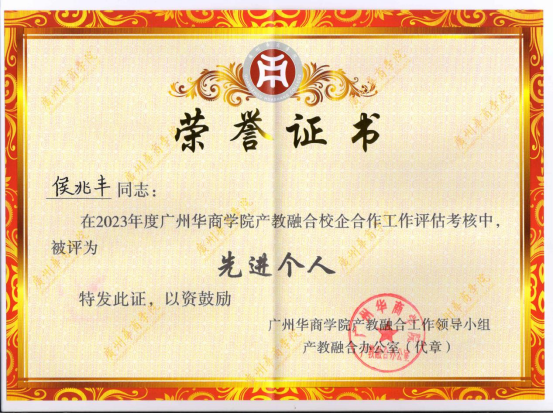 在会上,太阳成tyc9728集团凭借其在2023年度产教融合工作中的卓越表现,荣获“产教融合先进单位二等奖”。学院在产教融合领域的积极探索和显著成效,得到了校方的高度肯定。同时,侯兆丰老师以其突出的贡献被评为“优秀个人”。侯老师对学院产教融合工作的支持和贡献,为学院的发展增添了浓墨重彩的一笔。