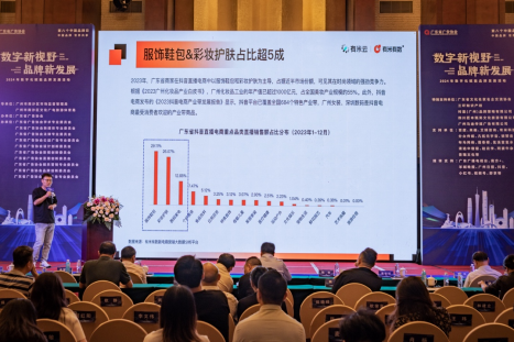 有米云品牌市场副总裁刁龙随后发表题为《品牌如何用数据工具提效短视频直播增长》的主旨演讲,刁总首先分析内容电商在当前的市场份额占比,广东在直播电商的排名一骑绝尘,服饰鞋包彩妆护肤占比超5成。内容电商与货架电商最主要的差异是在于场景化的嵌入,通过画面与声音的融入形成“亿人亿面”的叙事化的场景营销。以松鲜鲜品牌为例,通过明确目标受众的定位,与宝妈群体建立情感共鸣与信任,以视觉感知与心理联想为核心打造生活化营销场景。例如拍摄产品在煲汤、炒菜等不同烹饪场景中的应用,让消费者联想产品的品质和健康价值。