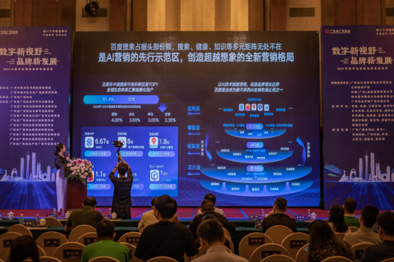 百度大健康行业高级总监赵会玲发表题为《拥抱AI,数字时代下,品牌营销的机遇与挑战》主题演讲,AIGC将逐步优化搜索,让长尾词成为消费者真正探究品牌的关键就决策路径。将品牌BOT全面升级为智能体,承接全域流量,打造新品牌、新内容、新场域,更加精准的触达用户。