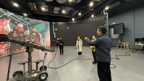 我系调研组在湖北工业大学数字艺术产业学院副院长邓诗元副教授及影视动画专业方向负责人王毅萍副教授带领下,参观了该院虚拟制片棚、影视拟音棚、声画交互设计实验室等实验教学平台,深入了解跨学科教育的理念和实操方法,为我系积极探索新闻教育与其他学科的交叉融合点提供了新视角。