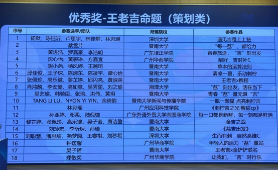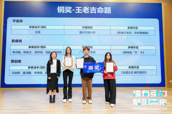 22级广告学的马佳婷、盘鸿敏、李浠桐小组同学创作的参赛作品《全荔出吉 鲜而易见》获得了王老吉品牌策划类的铜奖。