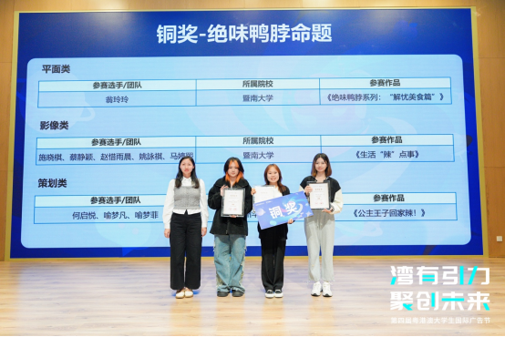 22级广告学的何启悦、喻梦菲、喻梦凡小组同学创作的参赛作品《公主王子回家辣!》获得了绝味鸭脖品牌策划类的铜奖。