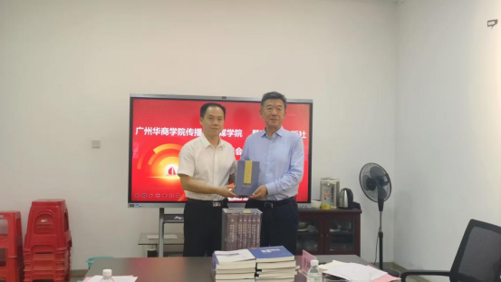 阳翼社长代表暨南大学出版社向我院捐赠珍贵图书,并与张晋升院长合影留念