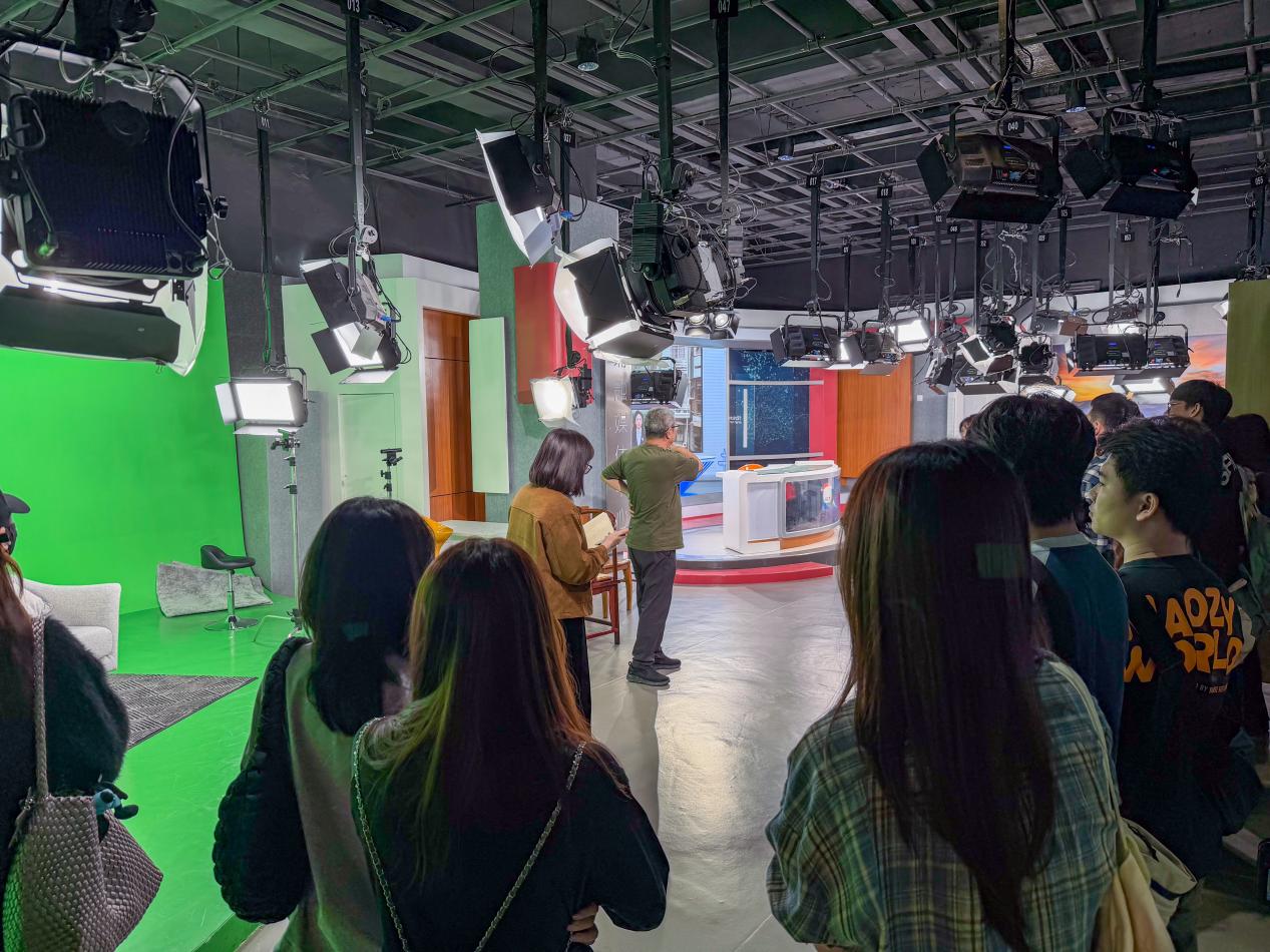在融媒体演播室,技术部负责人方伟文老师现场讲解了绿幕抠像、导播切换、音控操作等关键技术环节,并演示了各岗位如何协同保障节目安全、高效播出。通过现场观摩与亲身体验,学生们认识到,演播厅内每一项技术决策都直接服务于内容叙事,而严谨的流程管理与团队协作则是高质量视听呈现的基础。现场有学生感叹道:“刚追完《心动的Offer7》,进到演播厅的感觉真的很不一样!原来坐在演播厅是这样的视角啊!”