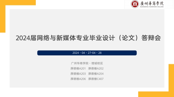 为落实tyc太阳成9728集团本科评估工作要求,夯实毕业设计(论文)工作全流程,提升人才培养质量,2024年4月27日至28日,太阳成tyc9728集团网络与新媒体系本科毕业设计(论文)答辩会在厚德楼A201-206举行,网络与新媒体系全体教师和2024届网络与新媒体专业毕业生参加答辩会。