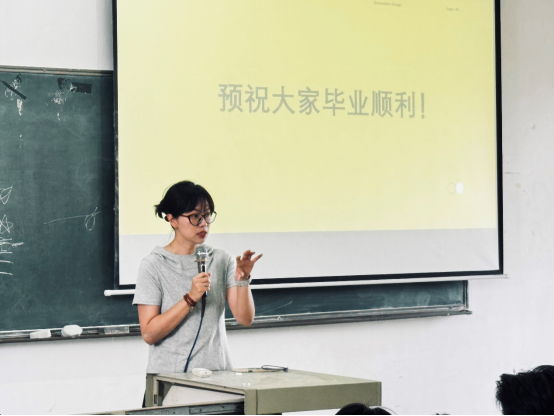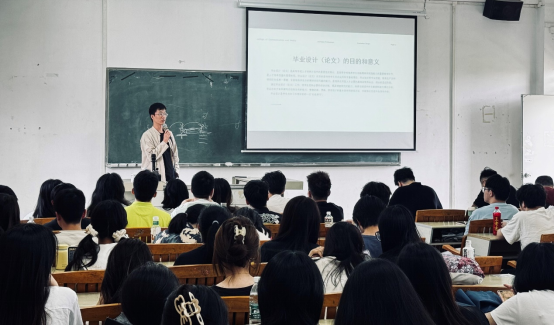 侯兆丰副主任则介绍了2025届本科毕业设计(论文)工作的总体要求,对如何做好本科毕业论文(设计)进行了详细讲解。从毕业论文的格式、内容、选题方向等方面展开,要求全体本科生要秉持学术诚信,拒绝拖延,谨慎思考自己的毕设选题,积极与指导老师沟通交流,并再一次强调,毕业论文的主题是:“讲好中国故事”,既可尝试优秀传统文化的相关选题,也可聚焦现实生活的相关选题;毕业论文应遵循学术规范,必须是严格的、精准的,而不是笼统的、空洞的、泛泛的而谈。